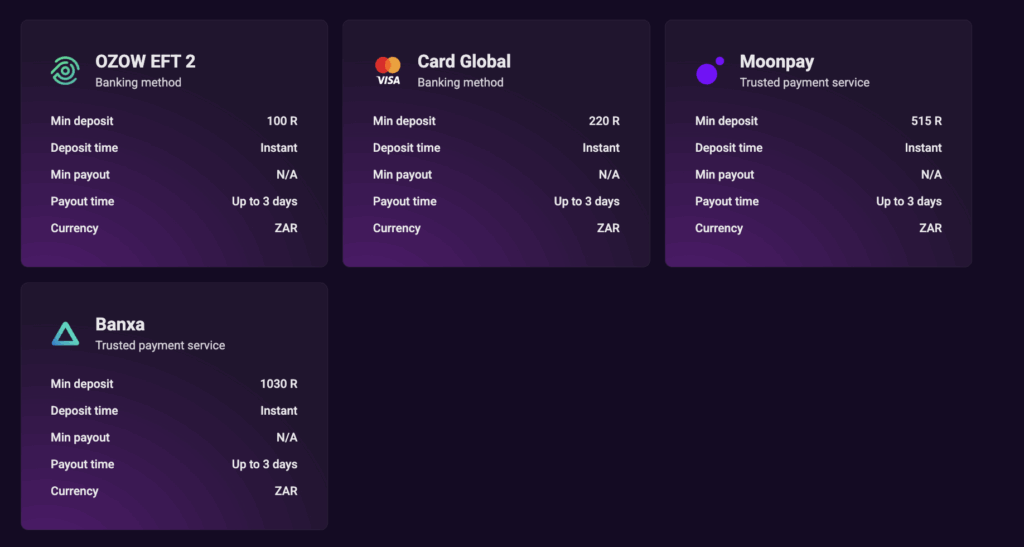 Banking page includes methods for deposits and withdrawals such as cards, e-wallets and local transfers. All payments are encrypted with SSL and processed quickly. Minimum deposits are low and withdrawals depend on verification and payment type.